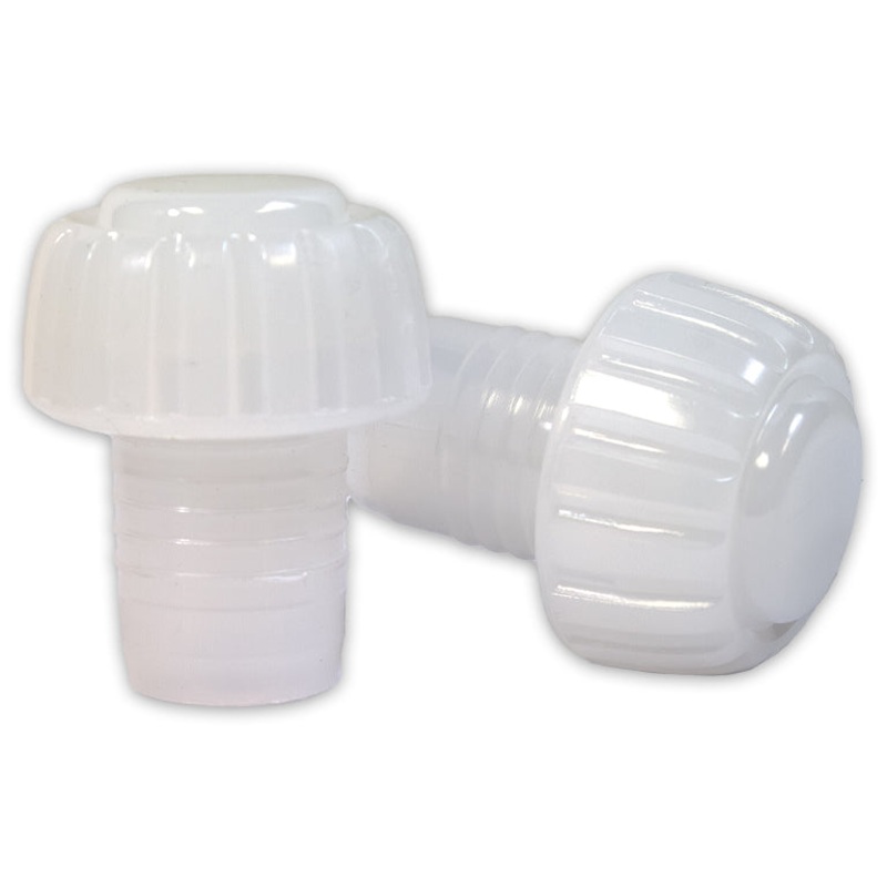 White plastic champagne stoppers for standard champagne bottles. Features plastic fins that secure stopper in bottle.