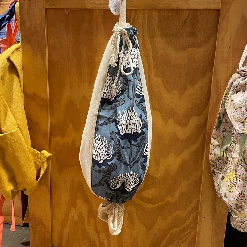 A super convenient way to store your produce or shopping bags. Put them in the top and close with the draw strong. Hang from a hook and pull them out from the elastic opening at the bottom.