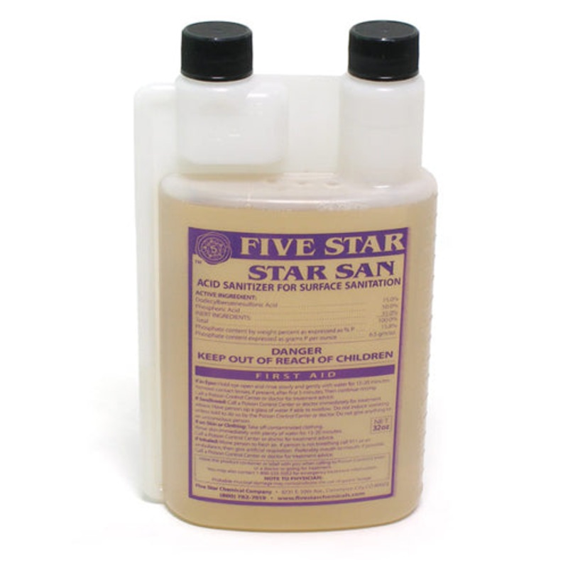 32 oz container of Star San SanitizerUse 2 tablespoons per 5 gallons of water, soak for 5 minutes. A foaming acid anionic sanitizer that penetrates hard-to-see places. No rinse. Does not stain and will not import odors or off flavors.6ml per gallon of H20